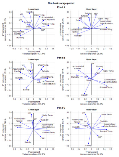 Figure 12, for the non-heat storage period, shows that the dominant parameters in PC 1 were weather variation, ambient temperature, accumulated solar radiation, humidity, and accumulated rainfall in each pond and both layers. On the other hand, the dominant parameters in PC 2 were water quality variation; however, the factor loading rank differed among the ponds and layers. The factor loading of water temperature in the lower layer of three ponds in the non-heat storage period was comparatively low, indicating a low correlation with the ambient temperature and solar radiation. In addition, the value of variance explained (shown in Table 5) was comparatively low, ranging from 32.0% (Pond C, Lower layer) to 37.4% (Pond A, Lower Layer) in PC 1, and from 17.3% (Pond B, Lower Layer) to 24.9% (Pond C, Lower Layer) in PC 2. This indicates that the variation of the obtained parameters in the non-heat storage period was dominated by multiple factors with incoherent variation patterns. On the other hand, from Table 5, for the heat storage period, the value of variance explained in PC 1 was higher than that for the non-heat storage period in each pond and layers, ranging from 41.1% (Pond A, Upper Layer) to 56.7% (Pond B, Lower Layer). Therefore, it could be considered that the variation of the obtained parameters in the heat storage period had a comparatively higher correlation with parameters than those of the non-heat storage period.