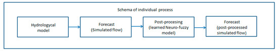 The aim of the described post-processing models based on trained neuro-fuzzy models is to reduce the error of the outputs from the hydrological model for events that were caused by rainfall. In the following text, hydrological forecast will be understood as the deterministic forecast obtained by the continuous hydrological model for gauged (forecasting) profile. The presented method focuses on runoff situations in which there is a risk of floods and thus a considerable pressure to provide the greatest possible reliability of flow forecasts. At the same time, however, we have to emphasize that the method does not solve the errors caused by inaccurate predictions of precipitation, which are often the dominant source of errors during floods. Figure 1 shows a flowchart for the process and also shows where the post-processing stage comes into play during this process.