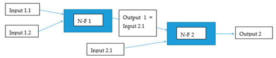 It is, therefore, clear from the previous text that the use of neuro-fuzzy models as a post-processing tool could bring the desired improvement of the existing hydrological forecast methods since the model itself, based on artificial intelligence methods, will be able to mitigate the prediction error. In the model architecture of the trained neuro-fuzzy model NFM, sequential aggregation of inputs was used [13] if the model used 3 or more inputs (Figure 2). Figure 3 depicts the model scheme without sequential aggregation of inputs. The advantage of a gradual aggregation of inputs is easier construction of the rule matrix. First, it is necessary to build a model architecture and a matrix of target behavior containing input-output relationships, because models based on artificial intelligence methods need patterns for their training (learning). Table 1 below lists the individual inputs that were used to find a suitable post-processing model architecture. All flow values are modeled flows by the hydrological model, unless stated otherwise for the flow parameter.