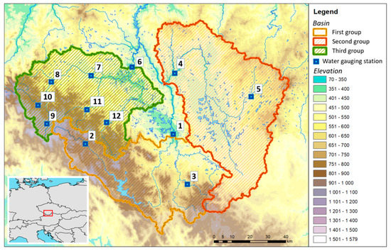 The model described in the previous chapter was applied to selected prediction profiles to test the possibilities of post-processing under various conditions. The area of interest was chosen because there are very diverse types of river basins. There are typical mountain catchments and catchments strongly influenced by agricultural activity as well as catchments with a high proportion of water areas. The profiles themselves were selected from a set of forecasting profiles included in the national flood forecasting service performed by the Czech Hydrometeorological Institute (CHMI). All the selected profiles are located within the Vltava river basin in the Czech Republic in the region of south Bohemia. Their positions are shown in Figure 4 and their brief description is given in Table 2. A total of 12 profiles were selected, which were divided into three groups according to their location. At the end of each profile name, a number is given in parentheses, which represents the position of the profile in Figure 3. The first group consists of the catchments of the Lenora (2), Ličov (3) and České Budějovice (1) profiles. The profile of České Budějovice is in this application the final profile of the whole first group and the area of its catchment area represents the whole area of the catchment area of the first group. The catchments of the Ličov and Lenora profiles are then sub-catchments. The basin of the Ličov and Lenora profiles mostly consists of forests and mountains. The profile of Lenor itself lies above the Lipno reservoir. The second group consists of the profiles Bechyně (4) and Rodvínov (5). The Bechyně profile is the final profile of the whole group. The Bechyně profile catchment area and its partial part of the Rodvínov catchment area are relatively flat with a large percentage of agricultural land and include a large number of ponds and pond systems (5.1% of the catchment area). The third group consists of the profiles Bohumilice (11), Katowice (7), Modrava (9), Písek (6), Podedvory (12), Stodůlky (10) and Sušice (8). The Písek profile is the final profile of the entire third group. The catchment area of the Bohumilice, Modrava, Stodůlky and Sušice profiles is mainly made up of forests. The catchments of the Bohumilice, Modrava and Stodůlky profiles themselves have a mountain character.