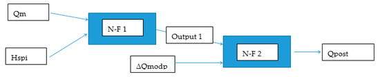 The best results in the validation stage were achieved using an architecture that used the current value of Qsim as input the gradient between the current and previous value ΔQmodp and the average of hourly precipitation total Hspi for the selected time period Γ [h]. The architecture described above will hereafter be referred to as the NFM 1 model. Figure 5 shows a diagram of the NFM 1 model and Figure 6 shows one of the local model (N-F).