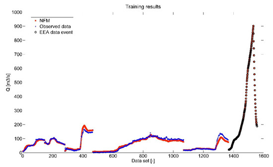The algorithm then calculates the ratio between the simulated and real values for each member of the series of the selected calibration event. The real values of the artificial event are obtained by multiplying the simulated values of the artificial event by the vector described above. According to the procedure described above, the EEA algorithm is able to prevent misleading of the NFM model. Models based on AI are usually not able to provide sufficient results outside their range of training (they are not appropriate for extrapolation).