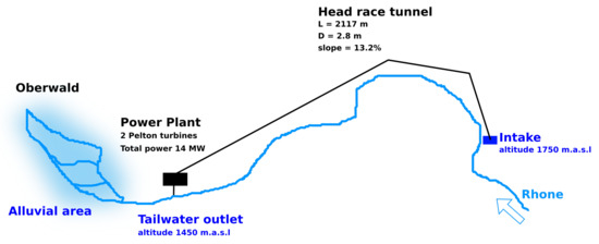 In the framework of the SmallFlex project [15], the team led by Haute-Ecole Spécialisée de Suisse Occidentale (HES-SO) in collaboration with Power Vision Engineering (PVE), Forces Motrices Valaisannes SA (FMV SA), the Swiss Federal Institute for Forest, Snow and Landscape Research (WSL), the Swiss Federal Institute of Aquatic Science and Technology (EAWAG), and the Swiss Federal Institute of Technology Lausanne (EPFL), focuses on the Gletsch-Oberwald (KWGO) small hydro power plant owned by FMV SA. This run-of-river power plant equipped with two Pelton turbines has a 2.1-km long head race tunnel, part of which can be used as new storage capacity [16]. The Smallflex project aims at demonstrating on a pilot site the possibility to increase production flexibility while limiting new additional costs and minimizing the impact on the environmental [17].