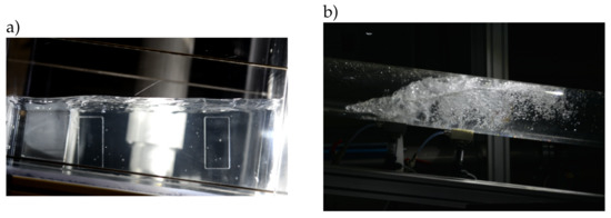 (a) Instantaneous picture of the free surface in the reduced scale forebay tank. (b) Instantaneous picture of the free surface in a partially emptied pipe. The flow discharge is set to its maximal value.