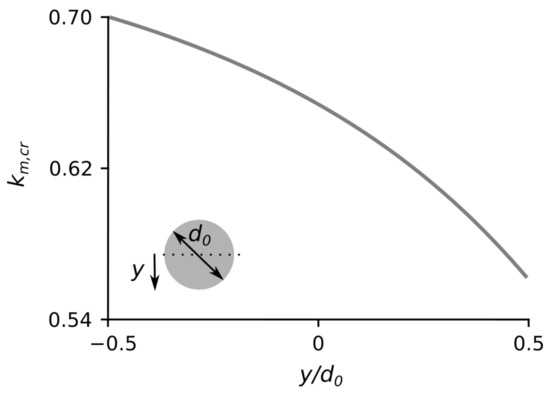 For and , the angle equals 30 and equals 0.65. However, the critical speed coefficient depends on the jet layer y as shown in Figure 4 derived from [21]. Therefore, the lowest value of the is around 0.55 gained for and using Equation (2), the critical head is around 220 m. Below this head, the “falaise” effect should occur.