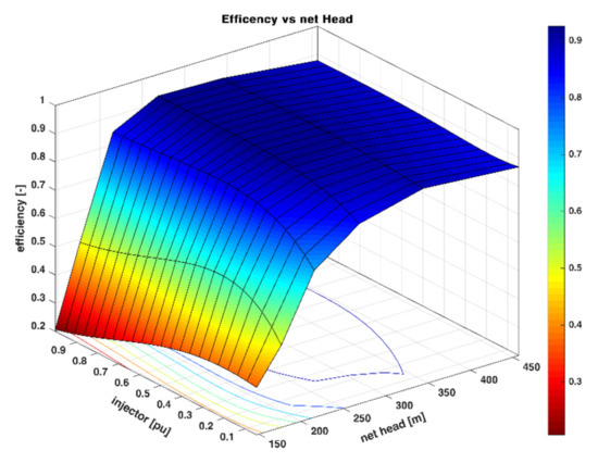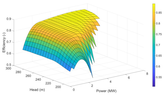 Such a value has also been estimated using the extrapolated turbine characteristic of the digital twin as shown in Figure 5 where it is noticeable that the efficiency drops from approximately 0.8 for a net head of 220 m to less than 0.5 for a net head of 200 m.