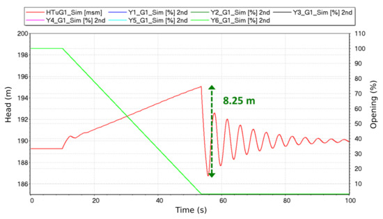 In addition, to anticipate the behavior of the power plant prior to on-site tests, simulations using the 1D dynamic model have been carried out including also an emergency shutdown when the head is below 190 m (see Figure 6). These simulations showed the possibility of performing an emergency shutdown during the dewatering of the headrace tunnel without major risk to the power plant in terms of pressure fluctuations induced by the water hammer.