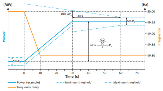 According to Swissgrid’s specifications, it must be possible to consistently activate the primary reserve power within 30 s and to deliver it for at least 15 min for any quasi-stationary frequency deviation of ±200 mHz. In addition, the power production must be within the tolerance bands shown in Figure 7. The amount of power delivered by a generating unit as a function of the frequency deviation in the network is typically characterized by the value of the permanent droop, defined as . For instance, a permanent droop of % corresponds to the provision of ±10% of the nominal power in case of a frequency deviation of ±200 mHz.