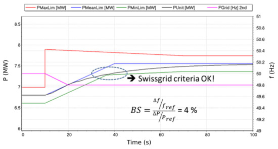 Simulated frequency response scenario meeting Swissgrid criteria with a permanent droop of %. is the limit of the maximum power accepted, is the limit of the mean power maximum accepted, is the limit of the minimal power accepted, is the power of the unit simulated, and is the frequency of the grid.