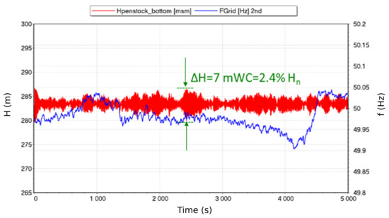 Simulation of the pressure fluctuations at the penstock bottom () generated by the grid frequency control.