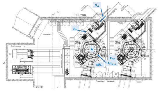 Locations of the various sensors around the Pelton turbine of group 2 with as the three axis accelerometer, as the microphone, N as the tachometer, as the pressure sensor in the power plant house, as the pressure sensor set at the inlet of the manifold, and as the flow-meter.