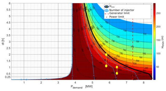 The second campaign has been designed to determine the performance map of the Pelton turbines and to define the safety limits of the power plant under low head operating conditions, i.e., by emptying the first third upper part of the head race tunnel. The design of the experiments requires to define specific maps allowing to provide a one-day production plan to FMV without losing water. One of these maps is shown in Figure 12 for an inflow discharge of 1.5 m s . It represents the available head as a function of the peak duration and power demand. The number of opened nozzles is also added on the map for information. The thick black line refers to the maximal possible power that can be satisfied during a peak of production. The yellow dash line shows the trajectory of a possible peak of production starting at a head of 284 m during 0.5 h at a constant power of 6.5 MW. When the head reaches a value of 270 m, the operating point is a switch to a constant power of 5.8 MW over 1 h. At the end of the peak, the head is equal to 220 m.