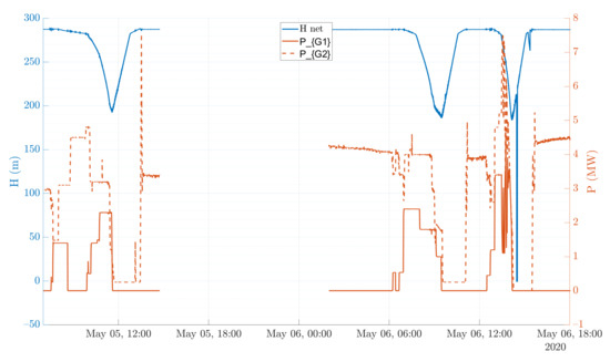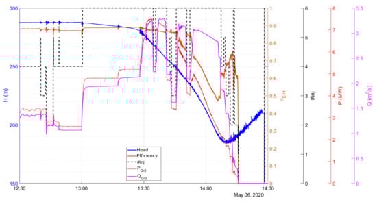 During the two days of tests, three peaks of production have been performed (see Figure 13). The first group G1 was used only to adjust the power of the entire power plant to avoid wasting water. Once on the first day and twice on the second day, the head has been lowered until a value around 190 m. The duration have been decreased from 3 h 35 for the first peak to 1 h 15 for the third one. The energy produced during the peaks is respectively of 12.8 MWh, 8.7 MWh, and 5.8 MWh. The power of the group has been varied during the peak (mainly the third peak) to sweep a large range of operating conditions.