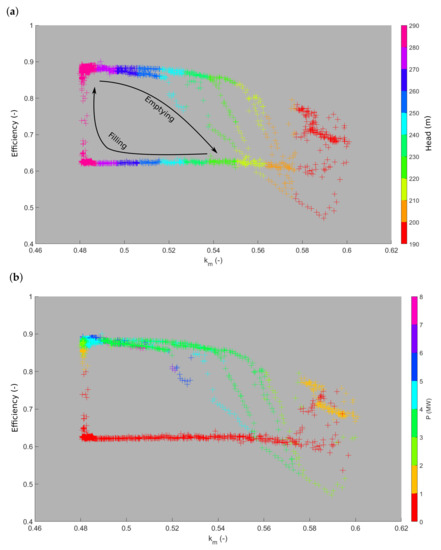 (a): Efficiency as a function of the peripheral speed coefficient colored by the head. (b): Idem as at the top but the symbols are colored by the power demand. The emptying and filling phases are identical for the two figures.