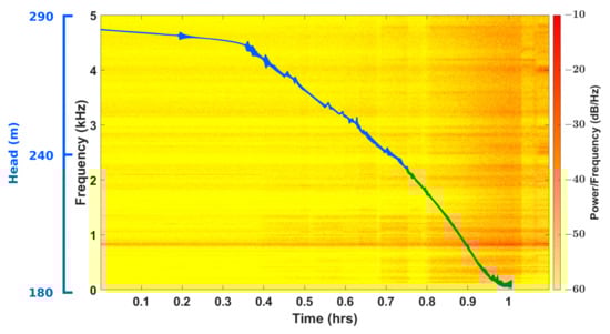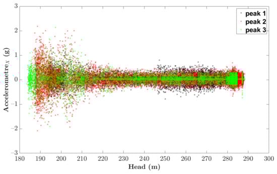 The amplitude of the accelerometer signal along the x-direction as a function of the head is shown in Figure 17 for the three peaks. Below a head of 215 m, the amplitude increases by a factor of 4, which corresponds to the region where the efficiency drops below 0.75 (see Figure 15 at the top). The spectrogram of the signal during the third peak is plotted in Figure 18 within the addition of the time history of the head. It is noticeable that the power of all the frequencies increases when the head decreases below approximately 230 m, which corresponds to the beginning of the “falaise” effect. The constant high amplitude at 800 Hz corresponds to the bucket passage frequency.