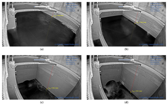 Free surface of the flow in the forebay tank at four different instants during the third peak. The red line and the yellow cross refer to the altitude of the free surface. (a) Free surface at the beginning of the peak, when the forebay tank is fulfilled, (b) free surface when the forebay tank is partially emptied, (c) free surface when it passes below the top of the head race tunnel, and (d) free surface passes when it passes through the middle of the head race tunnel.