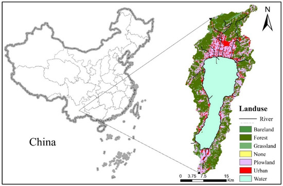 Located in the central part of Yunnan Province in China, the Fuxian Lake Basin is one of the key protected lakes in Yuxi City. It spans the Chengjiang, Jiangchuan, and Huaning counties of Yuxi City, with a drainage area of 674.69 km2 and a lake area of 216.6 km2. Other land use patterns in the study area are shown in Table 1. In recent years, with the development of the livestock industry and tourism in the Fuxian Lake Basin, NPS pollution has become increasingly serious [47], posing a critical threat to the ecological balance of local water bodies. The study area is shown in Figure 1.