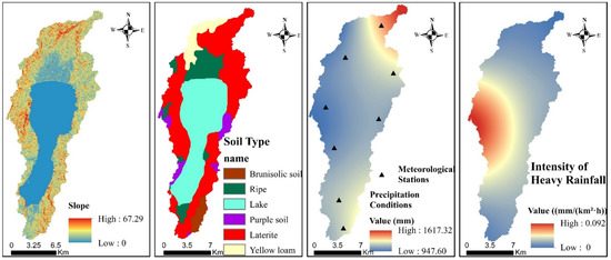 The basic data used in the study included information on the terrain (slope), soil type, precipitation conditions, and intensity of heavy rainfall. The distribution of different influencing factors in the Fuxian Lake Basin is shown in Figure 2.