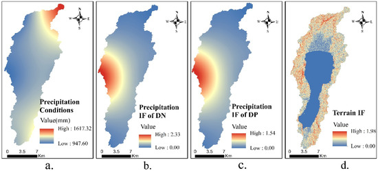 Influencing factors of different coefficients ((a): Precipitation Conditions; (b): Precipatation IF of DN; (c): Precipitation IF of DP; (d): Terrain IF).