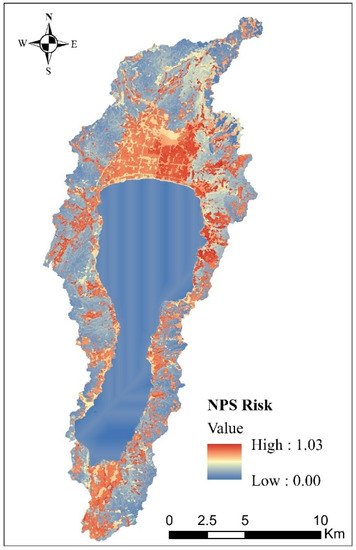 The final NPS pollution risk distribution map was obtained by superimposing the six factors, i.e., nitrogen, phosphorus, sediment, distance, slope, and rainfall, as shown in Figure 7. The distribution of the NPS risk level in Fuxian Lake as calculated using six factors is shown in Figure 6. It can be seen from Figure 6 that the higher the risk value of the non-point source pollution, the higher the risk of non-point source pollution is. According to the spatial distribution map of non-point source pollution risk in the Fuxian Lake Basin, it can be seen that the risk values range from 0 to 1.03, while the average risk value is 0.5015.