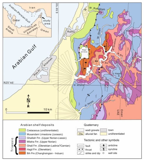- Maurer, F.; Rettori, R.; Martini, R. Triassic stratigraphy, facies and evolution of the Arabian shelf in the northern United Arab Emirates. Int. J. Earth Sci. 2008, 97, 765. [Google Scholar] [CrossRef]