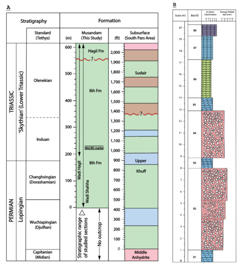 The Bih Formation (Permo-Triassic) crops out in the Musandam Peninsula, Ras Al Khaimah, northern United Arab Emirates (Figure 1). The formation is suggested to be age-equivalent to the Khuff Formation [19] which is an important hydrocarbon reservoir in the Arabian Gulf region. Deposition of the Bih Formation occurred in subtidal to intertidal (shoals, lagoon, and mudflats) environments on a passive margin of the Arabian plate [20].
