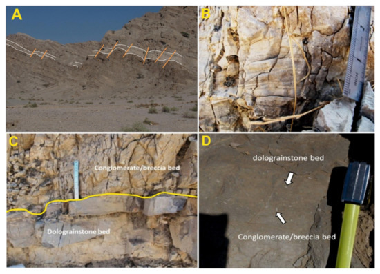 The base of the Bih Formation does not crop out, and the lowest stratigraphic part consists of a medium-to-thick-bedded brown dolomitized packstone–grainstones with locally well-developed coarse-crystalline dolostone and vuggy textures. About 180 m above the base of the exposed Bih Formation, the mid-Bih conglomerate/breccia occurs (approx. 20 m thick; Figure 2B and Figure 3A). The conglomerate/breccia beds of Wadi Bih, which are interbedded with dolograinstones, are massive overall but locally show a low-angle, through cross stratification (Figure 3B). The beds are cross cut by a series of normal faults (Figure 3A). The basal contact between conglomerate/breccia and underlying dolograinstone beds is sharp and erosional (Figure 3C). The lower contact between dolograinstone beds with the conglomerate/breccia beds is marked by the presence of rip-up dolomudstone intraclasts (Figure 3D).