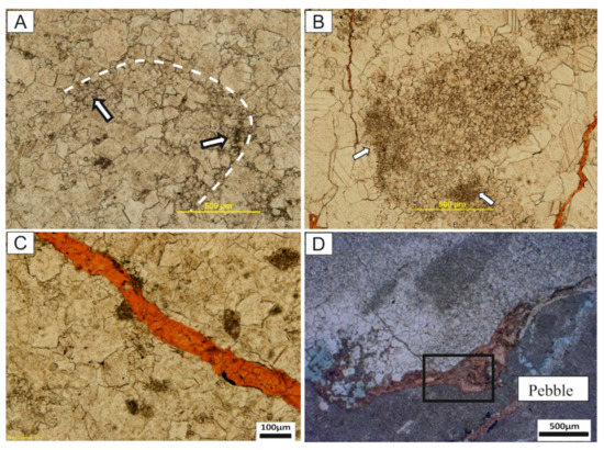 Optical photomicrographs (PPL) showing: (A) The fine dolomite crystals (arrows) in mosaic dolomite between pebbles are considered to be relics of fine-crystalline dolostone pebbles. The distribution of the fine dolomite crystals shows the rounded shape of pebble (dashed line). (B) The fine-crystalline dolostone pebble is partly replaced by the medium-crystalline dolomite (40 µm). Parts (arrows) of the pebble are not subjected to replacement. (C) Fracture cutting across the mosaic dolomite cement between pebbles was filled by the mosaic calcite cement (5 to 60 µm). The average width of this fracture is 70 µm. (D) Fracture-filling calcite along a pebble.