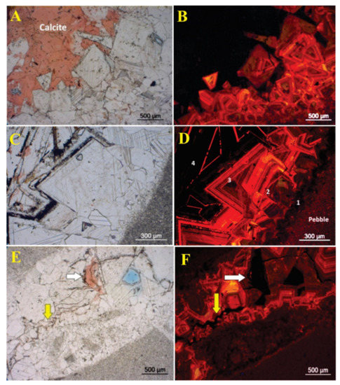 Optical (A; PPL) and companion CL (B) photomicrographs showing several generations of dolomite cement, which filled intergranular pores between pebbles are characterized by a distinguishable luminescent degree. Optical (C; PPL) and companion CL (D) photomicrographs showing: Coarse mosaic dolomite cement and coarse calcite cement, which is reddish stained in intergranular pores between pebbles; concentric growth pattern of planar-e to planar-s mosaic dolomite and non-luminescent calcite cements precipitated in pore space, where precursor dolomite was dissolved. Four generations of dolomite cement have been identified in the companion CL (D) photomicrograph. Optical (E; PPL) and companion CL photomicrographs (F) showing the calcite precipitated in intercrystalline pores between pebbles (white arrow) and within stylolite (yellow arrow) is characterized by a non-luminescent zone.