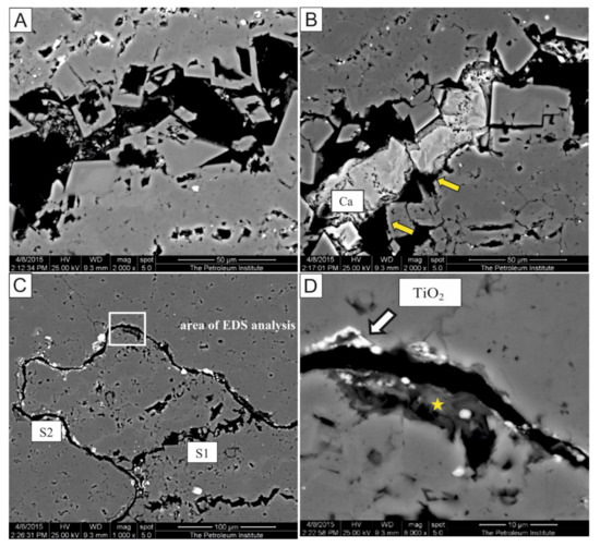 BSE images showing: (A) The presence of dolomite along a dissolution seam within a pebble. The core of rhombic dolomite crystals is dissolved while the rim is preserved. (B) Calcite cement (Ca) along the dissolution seam within the pebble, which precipitates after dissolution of dolomite (shown by an irregular boundary of dolomite crystal, yellow arrows). (C,D) stylolite/seams (S1 and S2) cutting across each other and the clay mineral and TiO2 occur along the stylolite/solution seam within a pebble.