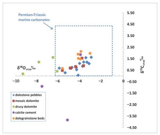 Cross plot of stable δ13CVPDB versus δ18OVPDB values of samples from the conglomerate/breccia beds and the dolograinstone beds in the conglomerate/breccia interval, as well as isotope values of Permian to Triassic marine carbonates. Stable oxygen isotope values of drusy dolomite are lower compared to other dolomites and slightly lower than sea coeval marine carbonates.