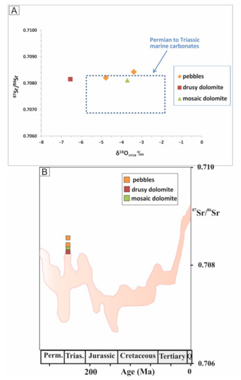 (A) Cross-plot of 87Sr/86Sr against δ18OVPDB showing two samples from the pebble have a slightly higher Sr isotope value than coeval marine carbonates. Two samples from drusy and mosaic dolomites are within the isotopic range of Permian to Triassic marine carbonates. The sample from drusy dolomite showing a lower δ18OVPDB value than coeval marine carbonates. (B) Measured 87Sr/86Sr ratios of different types of dolomite cements in the Bih Formation (Permo-Triassic) plotted on the sea water 87Sr/86Sr curve [31].