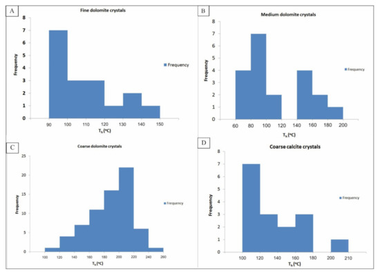 Histograms of fluid-inclusion homogenization temperatures (Th) in fine-crystalline dolomite (A), medium-crystalline dolomite (B), coarse-crystalline dolomite (C), and calcite (D).