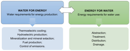 Besides the reduction of wastewater discharged to the environment, the use of WtR has implications also in the corresponding energy consumptions that are associated with water pumping, treatment and distribution. In fact, there is an unquestionable connection between water and energy, which supports the need to consider an integrated approach of these two resources. Water is essential to energy production as energy is fundamental for urban, agricultural and industrial water supply and consumption. Energy and water fulfill reciprocal functions in which working on one of them relies on the status of the other in terms of cost and availability [12]. Matos et al. [13] presented a methodology to calculate the energy consumption and CO2 emissions related with different types of reuses. Its application to a centralized and a decentralized greywater reuse system revealed that the first one needs a higher degree of treatment and spends more energy, leading to more CO2 emissions to the environment. This interdependence—the water–energy nexus (Figure 1)—becomes more complex with economic growth, population increase, energetic crises and the impact of climate changes.