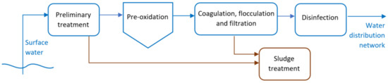 Finally, in the Espinho municipality, potable water supply is provided by Lever Water Treatment Plant (WTP), which extracts water from the Douro River and carries out the following treatment stages (Figure 4): preliminary treatment (pressurized filtration), pre-oxidation with ozone, coagulation-flocculation, multilayer filtration and disinfection with chlorine [26].