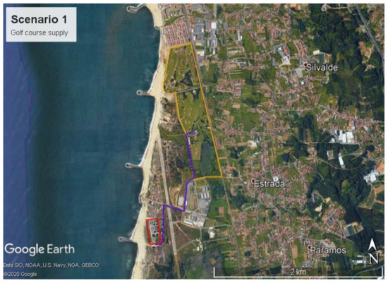 Finally, in the last scenario, both golf course and municipal irrigation were considered. The goal was to supply WtR (about 34,654 m3/year) to these two non-potables uses (Figure 7). The supply was also considered to be provided by a pressurized network from the WWTP to the municipal irrigation areas, with a derivation to the golf course. Post-disinfection units must be considered for all the supply areas in this scenario, due to the reasons explained above.