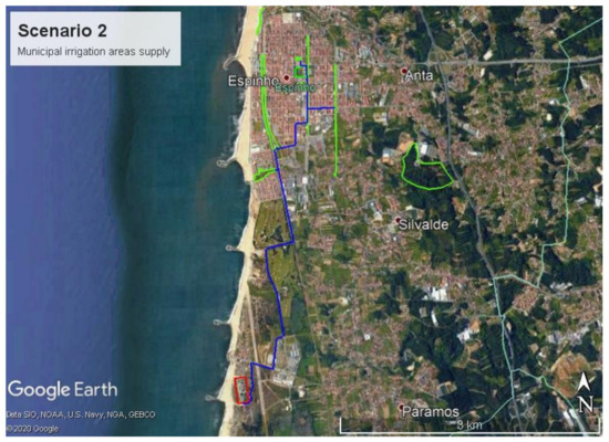 Scenario 2: WtR supply, provided by Espinho WWTP (in red), by pressurized network (pipe in blue) to the municipal irrigation areas marked in green.