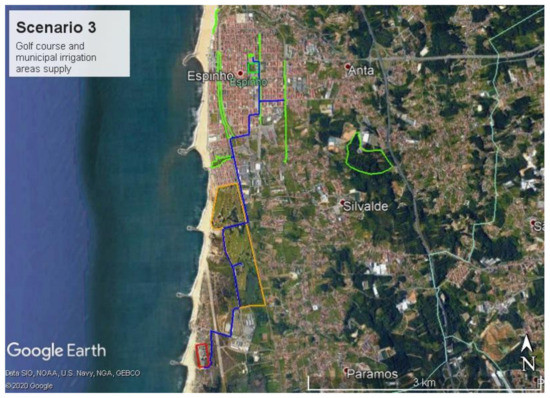 Scenario 3: WtR supply, provided by Espinho WWTP (in red), by pressurized network (pipe in blue) to the Oporto Golf Club bordered in orange and to the municipal irrigation areas marked in green.