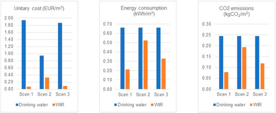 Unitary cost, energy and CO2 emissions considering a supply with drinking water and with WtR.
