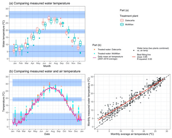 Water temperature measurements and air temperature records from the local weather station (Reagan National Airport) for Washington D.C., with (a) boxplots of monthly average temperature measurements of treated water (water entering the distribution system) in the two treatment plants of Washington Aqueduct [71] during the period 2001–2018 (each boxplot shows values across the period 2001–2018) and annual water temperature results in the DWDS provided by the DC Water drinking water quality reports [72] for the period 2003–2017; and (b) comparison with the air temperature records from the weather station (with the bottom left graph presenting the seasonal variations and the bottom right graph presenting the scatter plots of monthly measured water temperature of treated water vs. monthly average air temperature). In part (a), the three shaded bars present the reported annual maximum, average, and minimum water temperature in the DWDS from the drinking water quality reports [72] for the period 2003–2017 (with the bounds and bold lines representing the highest, lowest, and mean values reported every year between 2003 and 2017). Monthly temperature measurements for the treated water are presented as points in part (b), instead of boxplots as in part (a).