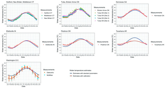 The results of water temperature estimation using the NREL model for Washington D.C. and the other six locations are presented in Figure 2 using both standard parameter values and calibrated parameter values. The water temperature measurements for the other six locations (with 12 residential sites; some sites are within close proximity and were thus combined) were collected by Abrams and Shedd [24] during the period 1994–1995. As previously discussed, the temperature measurements for the other six locations are the recorded water temperature in the supply piping of the residential sites. As presented in Figure 2 (and in Figure 1 for Washington, D.C.), seasonal changes of water temperature records throughout the year can be observed across all seven locations (although the water sources for the measurements provided by Abrams and Shedd [24] are unclear) and are consistent with the assumption that the water temperature exhibits sinusoidal variation with time. Thus, the use of air temperature to provide water temperature estimates with similar sinusoidal, seasonal variation in the NREL model is appropriate. Similar to the findings of Żukowski [25], using the standard parameters of the NREL model provides reasonable estimates of the measured water temperature, with the exception of Texarkana, AR for which the estimates show greater seasonal changes. After application of numeric optimization for further calibrating the NREL model (calibration of the parameter values for individual assessed locations), RMSEs were (averaged across all locations) reduced from 1.98 to 1.01 °C. The reduction in the RMSE by approximately 50% is consistent with the results of Żukowski [25]. As the different sites within each location (or city) also exhibit variations from the average estimates for that city (e.g., at different sites of Tulsa in Figure 2), the NREL model can be further calibrated to the individual sites to provide better estimates. If additional site-specific measurements are available, the NREL model can thus likely be improved to provide location-specific water temperature estimates.