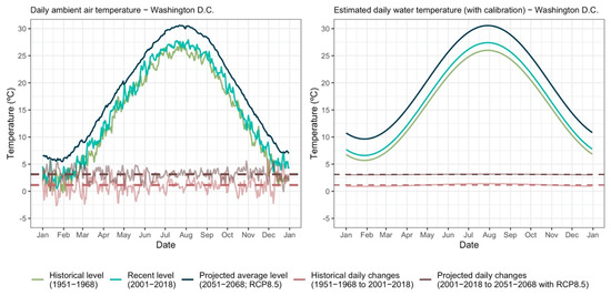 An assessment of daily air temperature records and projection and daily water temperature estimates between a historical period (1951–1968), a recent historical period (2001–2018), and a projected future period (2051–2068) for Washington D.C. The results of the daily air temperature in the two historical periods are the averaged daily values for the two periods, while the presented air temperature projection is an average projection in daily resolution from the G-ARIMA model (and consequently exhibits less daily variations compared to the two historical levels). The three periods were assessed because of the avaialable measurements for the period 2001–2018. Daily water temperature estimates were calculated based on the air temperature of these three periods. The results of the daily changes and their annual averages (presented as the dashed lines) are based on the differences of the daily water temperature estimates between the three periods.