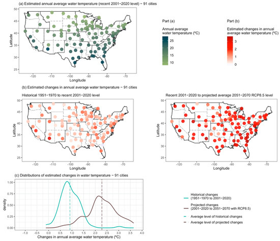 The estimation of DWDS water temperature was then conducted for 91 cites and historical and future projected changes were calculated. The results are presented in Figure 4. As previously discussed, the presented results of annual average water temperature estimates and the estimated changes in water temperature were mainly determined by the annual averages of air temperature records at these cities. The results of Figure 4 (i.e., when averaged across all cities, an approximately 0.8 °C increase from the 1951–1970 to 2001–2020 level and 2.3 °C increase from the 2001–2020 to 2051–2070 level under RCP8.5) are consistent with the estimated air temperature change for the U.S. (e.g., a 0.7 to 1.0 °C increase from the 1901–1960 to 1986–2016 level and a further 3.0 to 6.1 °C increase under RCP8.5 in the late 21st century relative to the 1986–2015 level [1]). Calculation of the changes in annual average air temperature can thus provide an efficient estimate of the changes of water temperature in DWDS. Further calibration of the NREL model with modification of the parameter values for particular locations can increase the alignment of estimated water temperature to the seasonal variation of observed water temperature but it does not alter the results of estimated changes in water temperature on an annual average basis.