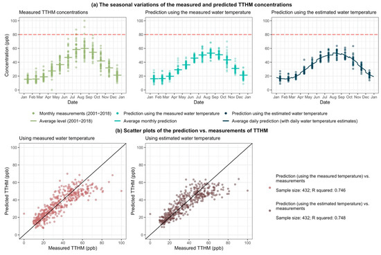 The measured and predicted TTHM concentrations for Washington D.C. with (a) seasonal variations of the monthly measured and predicted (using measured or estimated water temperature) TTHM concentrations for the same period 2001–2018; and (b) the comparisons between the predicted TTHM concentrations (with the use of measured or estimated water temperature) and the measured monthly average TTHM concentrations. The predictions were obtained using the empirical model presented as Equation (4) of Table 1. The measurements of TTHM concentrations were obtained from the treated water (measurements of TTHM in the DWDS are limited). As monthly measurements of other required parameter values were kept the same and used for the daily calculation in the rightmost graph of part (a), the daily estimates exhibit sudden shifts in different months. The red dashed lines in part (a) present the regulated level (80 ppb) for TTHM concentrations [75].