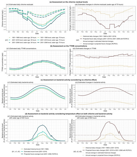 Estimated historical and projected water quality parameters and their changes for Washington D.C. with respect to daily (a) chlorine residuals with 30 h and 75 h water age values (considering only bulk decay); (b) TTHM concentrations in treated water; (c) bacterial activity (for fixed bacteria) considering no chlorine effect; and (d) bacterial activity (for fixed bacteria) considering the aggregate temperature effect on bacterial activity and chlorine residual (for a hypothetical location and an extreme case with a 400 h water age value). As monthly measurements of other required parameter values were kept the same and used for the daily calculation, the daily estimates exhibit sudden shifts in different months. The results of estimated bacterial activity are higher in part (c) than part (d) is because part (c) assumes no effect of chlorine.