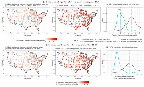 Using the water temperature estimates for the 91 U.S. cities, the historical and projected changes in the water quality parameters resulting from interannual ambient air temperature changes were evaluated and are presented in Figure 7. Two water quality parameters (the chlorine bulk decay rate and bacterial activity) were assessed.
