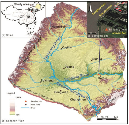 Topographic map of the sampling site, (a) China, (b) Songnen Plain, (c) Sampling site.
