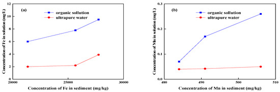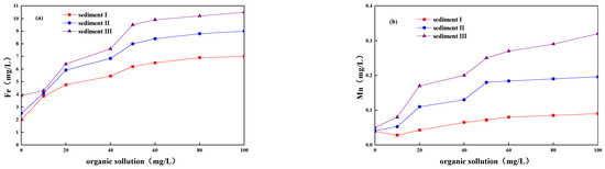 Relationships between equilibrium concentrations of Fe and Mn and organic solution, (a) Fe, (b) Mn.
