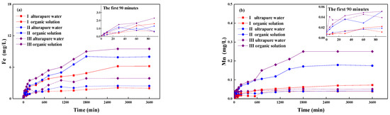 After reaching dynamic equilibrium in the organic solution systems of the three sediment samples, the concentrations of Fe of I, II, and III samples were 2.00, 2.44, and 3.89 mg/L, respectively, and the values of Mn were 0.039, 0.041, and 0.051 mg/L, respectively. That is to say, the higher the content in the sediment, the higher the corresponding concentration in the leachate after reaching equilibrium (Figure 4). Specifically, the concentration of Fe in the leachate increased by 2–37% for every 1000 mg/kg increase in the contents of Fe-bearing minerals in the aquifer sediment. Mn’s corresponding value was 7–200% for every 10 mg/kg increase in the contents of Mn-bearing minerals in the aquifer sediment.