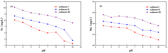 The equilibrium concentrations of Fe and Mn in the leachate decreased linearly with the increase of pH (Figure 7), that is, the higher the pH of the solution for leaching, the lower the equilibrium concentration of Fe and Mn in the leachate. For the three samples, the concentration of Fe in the leachate decreased by 0.2–0.6 mg/L for every one pH increase of the solution. The corresponding value of Mn was 0.003–0.02 mg/L. Specifically, the concentration of Fe in the leachate decreased by 10–60% for every 1% pH increase of the solution. And the average decrease was 45%. The corresponding value of Mn was 11–80%, and the average decrease was 36%.